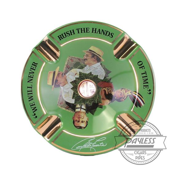This is a vibrant green and gold ashtray with an image of four people, oriented to the top, bottom, right, and left. It depicts the Goddess of Tobacco and the three generations of Fuentes: Arturo Fuente, Carlos Fuente Sr., and Carlos "Carlito" Fuente Jr. The four figures surround the red and gold AF logo in the center of the ashtray, which is encircled in lush, green tobacco leaves. The iconic motto of Arturo Fuente, in the middle and text "We will never rush the hands of the time" above them quote is written around the outside edge of the ashtray. Amongst these words are the 4 golden grooves, which allow up to four smokers to securely rest their cigars in the ashtray, without concern that the cigar will roll away or tip out.