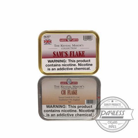 The Samuel Gawith Chocolate Flake Tin showcases a Virginia Based blend and a flake cut tobacco combining for a medium bodied smoking experience. While the Samuel Gawith Sam’s Flake Tin brings an Oriental blend to the table with the same flake style cut to present a mild to medium bodied smoke. Buy the Samuel Gawith Kendal Mayor Sampler at Payless and leave us a review letting us know what you think about this premium pipe tobacco collection!